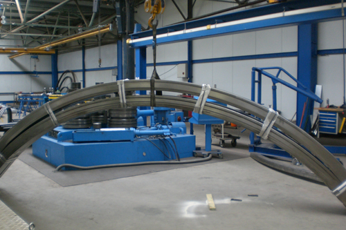 Für Winkel, Träger und Flansche ist die Ringbiegung erforderlich. Wir können auf diese Weise Flachstahl und Rohre nach Ihren Vorgaben bearbeiten. Mit Zusatzvorrichtung wird auch über beide Achsen und mit gleichbleibenden Radien gebogen.